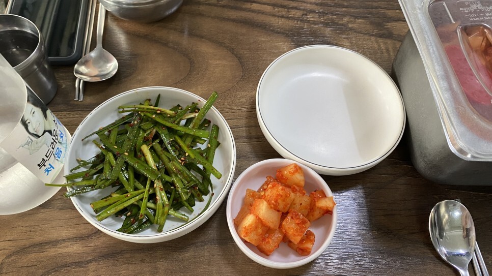 밑반찬은 부추무침과 깍두기 두 가지예요